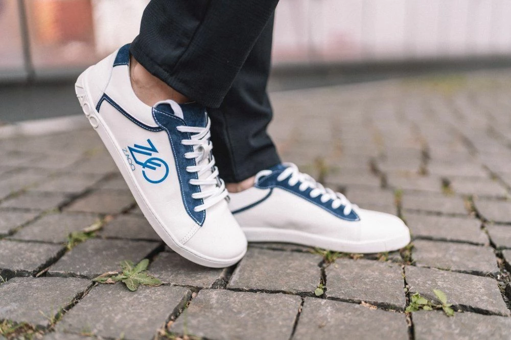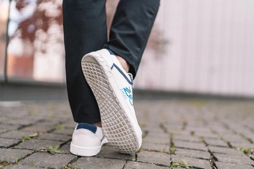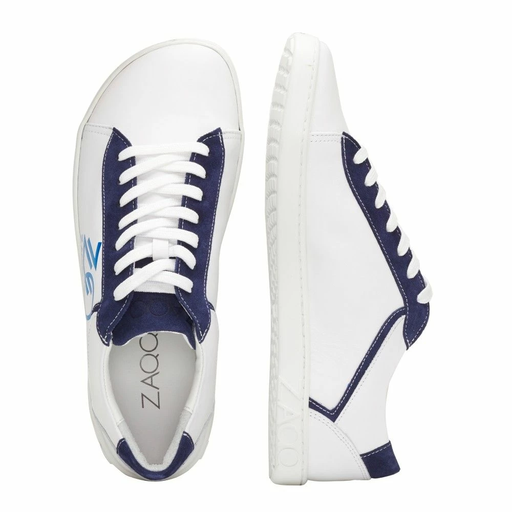 Das schneeweiße Nappaleder wurde mit dunkelblauem Veloursleder abgesetzt, wodurch nicht nur ein interessanter Kontrast entsteht, sondern der Barfußschuh auch optisch gestreckt wird. Die breiten Schnürsenkel passen perfekt zum restlichen Design und mit dem ZAQQ Logo zeigst Du auch nach außen, dass Du auf Qualität großen Wert legst.