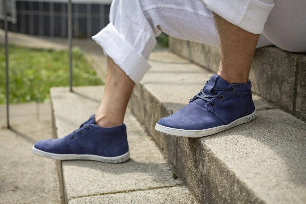 Dieser halbhohe Barfußschuh für Herren ist aus samtigem Veloursleder gefertigt. Das dunkelblaue Design bekommt mit der weißen Sohle einen sportlich-modernen Touch. Innen haben wir besonders weiches und atmungsaktives Baumwollgewebe vernäht, welches sich einfach wunderbar anfühlt.