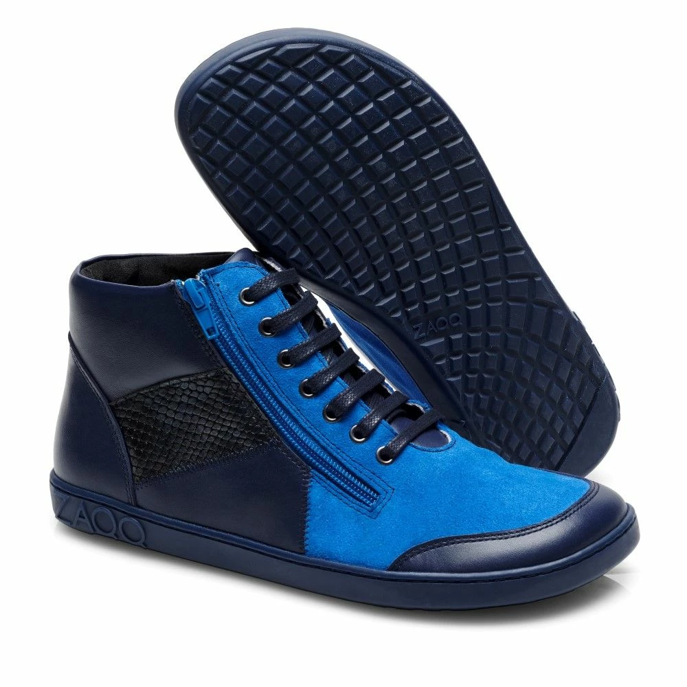 Damit Du den halbhohen Sneakerboot bequem anziehen kannst, ist ein seitlicher Reißverschluss integriert, der genau die Linie zwischen dem himmelblauen Veloursleder und dem dunkelblauen Nappaleder aufnimmt und den Barfußschuh damit optisch streckt.