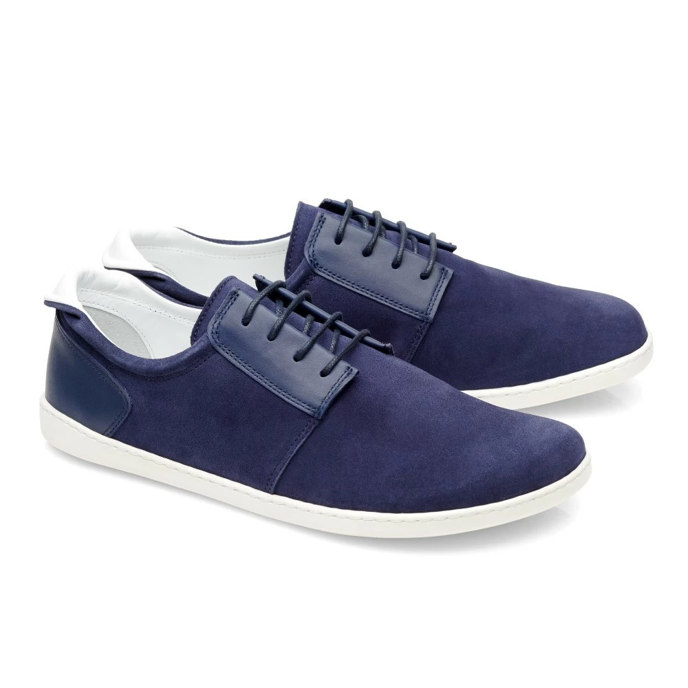 Das Obermaterial besteht aus hochwertigem Veloursleder, welches im Schnür- und Fersenbereich mit Nappaleder abgesetzt ist. Ton in Ton gehalten, greifen auch die Schnürsenkel den dunkelblauen Farbton auf. Mit dem Innenfutter aus anschmiegsamen, weißen Glattleder und der weißen Sohle erzeugen wir einen tollen Kontrast, wodurch der Barfußschuh leicht und modern wirkt.