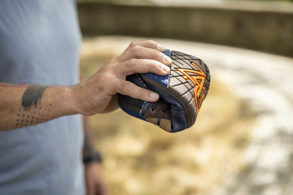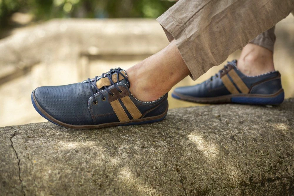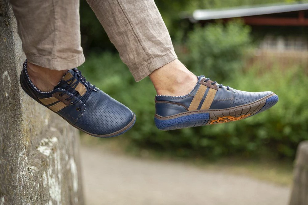 Der dunkelblaue Barfußschuh sieht mit den braunen Akzenten zeitlos und trotzdem modern aus. Herrlich wandelbar kannst Du ihn sportlich zur Used Jeans oder auch elegant zur Chino- oder Anzughose tragen.