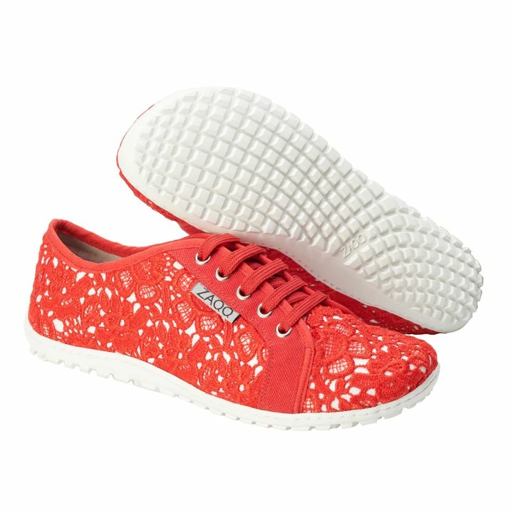 Die besondere Optik bekommt unser QELLY durch das feine Stickgewebe in kräftigem Rot. Das Muster, welches durch das darunterliegende weiße Textilgewebe nochmal besonders gut zur Geltung kommt, sieht einfach zauberhaft aus und gibt diesem Barfußschuh die feminine Note.