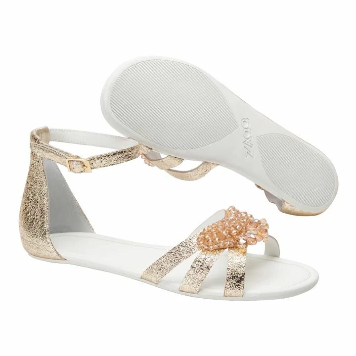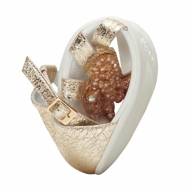 Feinstes Nappaleder in Goldoptik und harmonisch drauf abgestimmte, stilvolle Steinchenapplikationen, welche die Riemen im vorderen Bereich zieren, bilden eine märchenhafte Komposition.