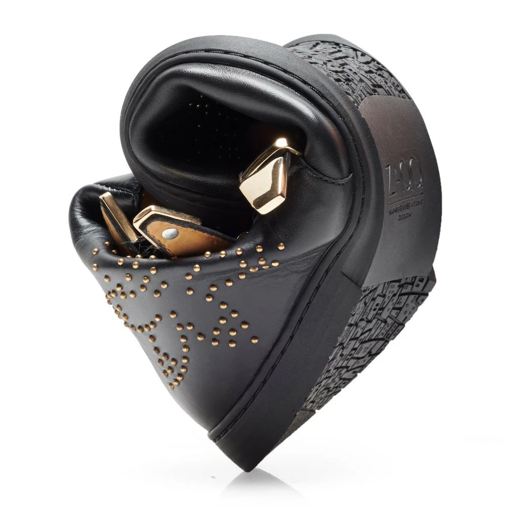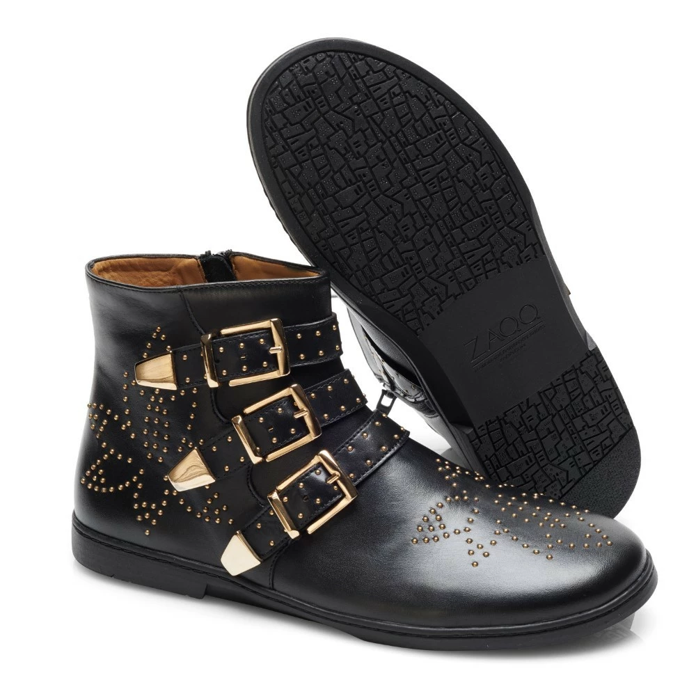 Reich verziert mit goldfarbenen Nieten in floralem Design, die auf dem schwarzen Leder besonders zur Geltung kommen, und der dazu passenden Dornschnalle, wird QLANCE garantiert die Blicke auf Dich ziehen. Du kannst einen rockigen Style mit unserem Barfuß-Stiefel veredeln und schlichte Outfits aufmotzen.