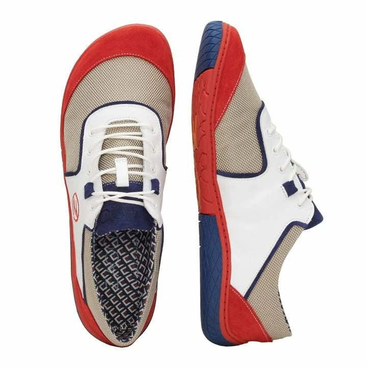 Für QOLE verwenden wir verschiedene Materialien, die nicht nur das Design ausmachen, sondern ihn auch zum Funktions- und Komfortwunder werden lassen. Das besonders anschmiegsame Meshgewebe ist hochatmungsaktiv und lässt Deine Füße auch bei sportlichen Aktivitäten nicht im Stich. Die roten Velourslederteile verstärken den Barfußschuh in den besonders beanspruchten Bereichen. Für Stabilität sorgt das schneeweiße Nappaleder, welches für die Optik mit dunkelblauem Veloursleder gerahmt ist.