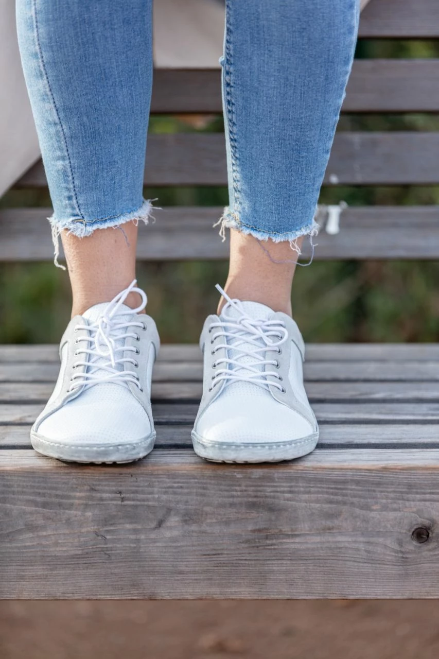 Ein heller Sneaker, der mit seinem weißen perforierten Nappaleder und dem beigefarbenen Veloursleder megamodern aussieht. QORE Low White ist Dein Barfußschuh, der Style und Komfort perfekt vereint.