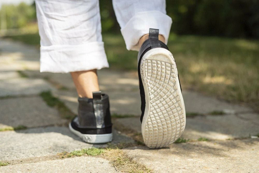 - Kautschuksohle mit Nullabsatz, dadurch Entlastung der Wirbelsäule und Schonung der Gelenke, unterstützt die natürliche Körperhaltung