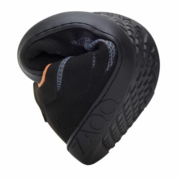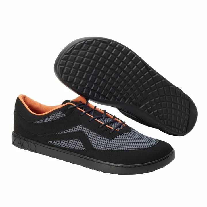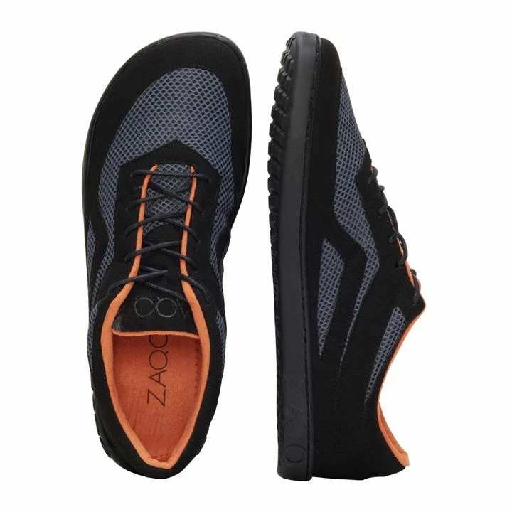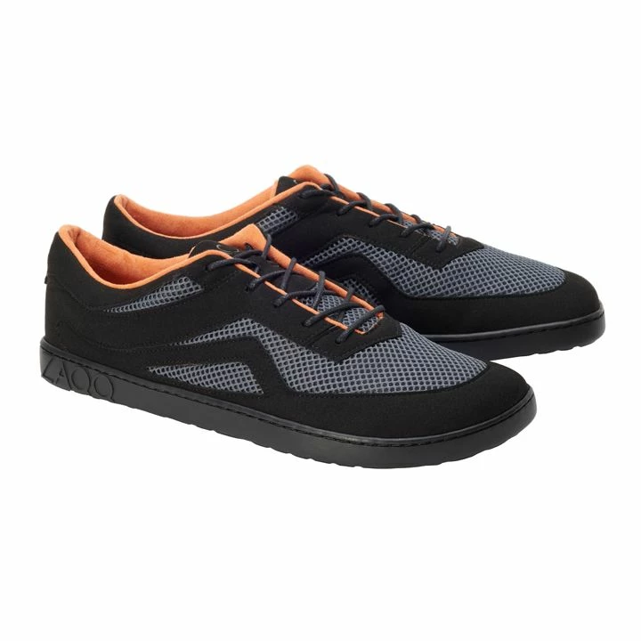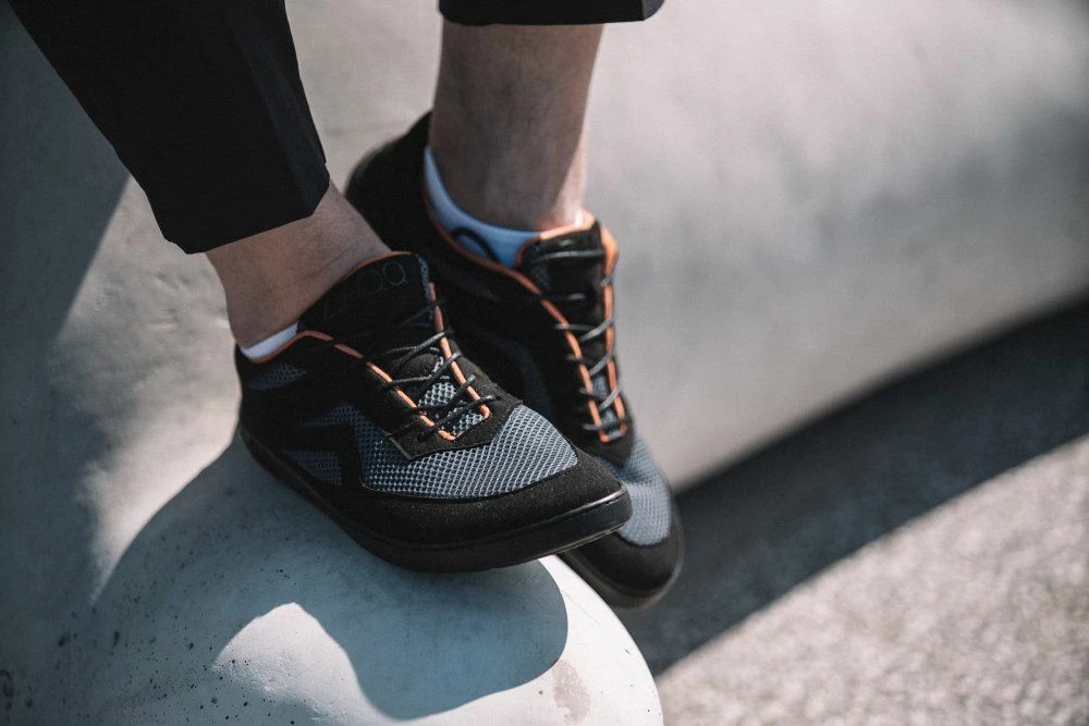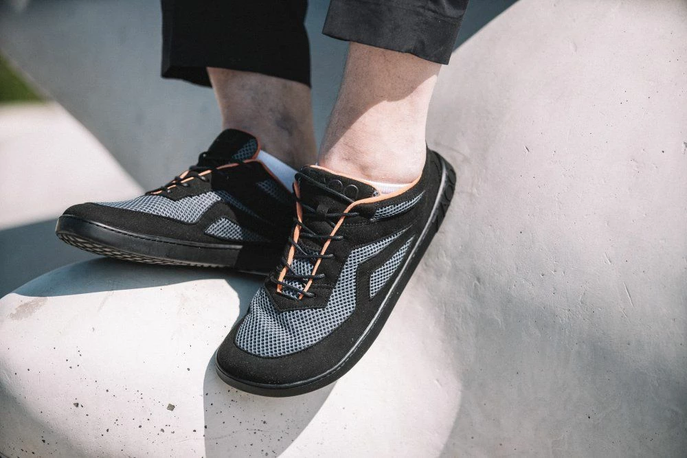 Das schwarze Veloursleder gibt unserem QYNLEE Stabilität und Robustheit. Aber nicht nur das, durch den Verlauf der schmalen Seitenstreifen, wirkt der Barfußschuh auch deutlich schmaler als er in Wirklichkeit ist. Das graue Meshgewebe bildet einen feinen Akzent zum Schwarz und lässt Deine Füße selbst bei hoher Beanspruchung atmen. Für den ultramodernen Look lassen wir das orangefarbene Innenfutter im Bereich des Schaftes und der Schnürsenkel etwas herausschauen. Damit ist unser QYNLEE zwar immer noch zurückhaltend dezent, aber gleichzeitig aufregend frisch.