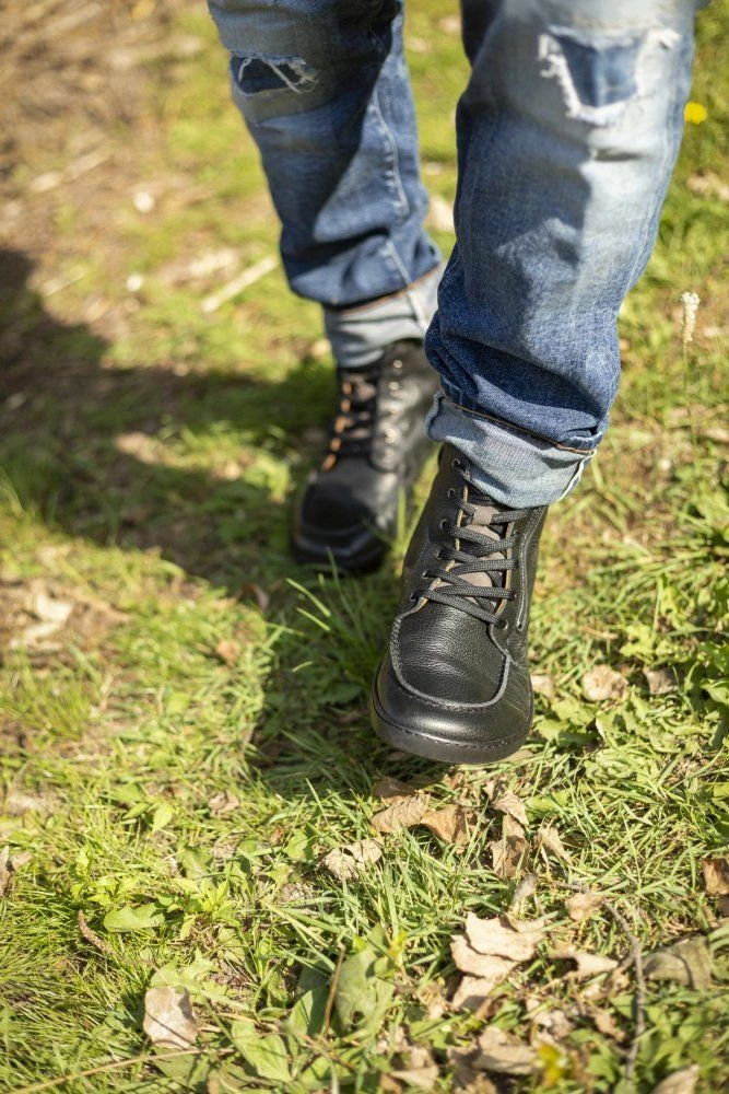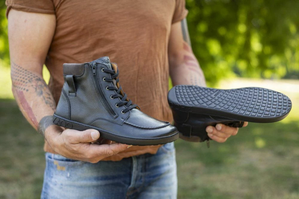 - Kautschuksohle mit Nullabsatz, dadurch Entlastung der Wirbelsäule und Schonung der Gelenke, unterstützt die natürliche Körperhaltung